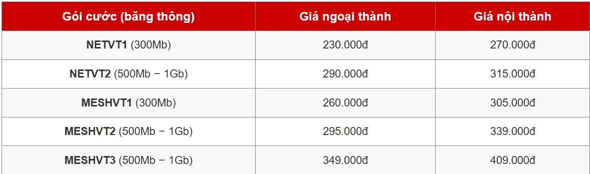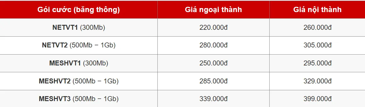| Gói cước (băng thông) | Giá ngoại thành | Giá nội thành |